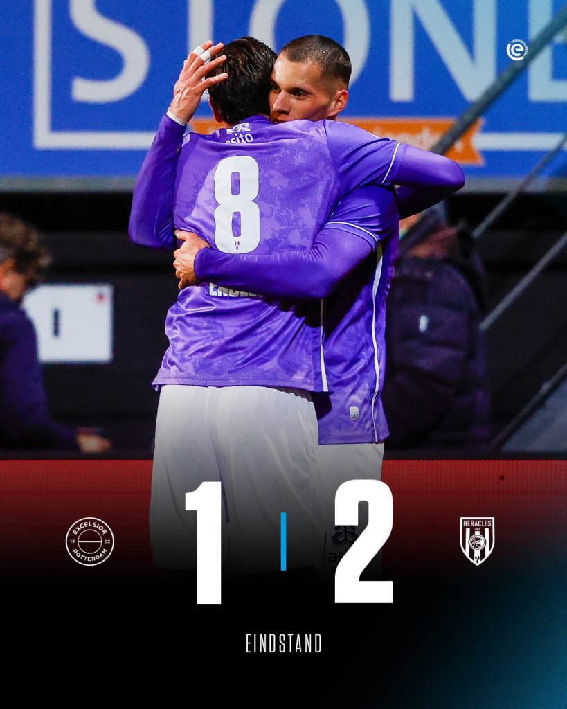 Μια εβδομάδα μετά το εκκωφαντικό 8-2 επί της Τσβόλε, η Χέρακλες πήρε διπλό, 2-1 στην έδρα της Εξέλσιορ, παραμένει ουραγός, ωστόσο, βρίσκεται, πλέον, μια ανάσα από το να είναι εκτός της ζώνης υποβιβασμού. Στο Ρότερνταμ, η γηπεδούχος Εξέλσιορ άνοιξε το σκορ στο 8ο λεπτό, με τον Ολλανδό μεσοεπιθετικό Νόα Νάουγιοκς, αλλά, στην επανάληψη, δέχτηκε δυο γκολ σε 19 λεπτά. Με τη συμπλήρωση μιας ώρας αγώνα, ο Βαλίντ Ουλντ-Σικ, δανεικός από τη Μπράουνσβαϊγκ, ισοφάρισε για τη Χέρακλες, με την Εξέλσιορ να χάνει τεράστια ευκαιρία, στο 64', για το 2-1. Ο Σίμον Βλόνταρσικ έχασε πέναλτι και, στο 79ο λεπτό, ο Βόσνιος φορ Λούκα Κουλένοβιτς διαμόρφωσε το τελικό 1-2 για τη Χέρακλες. Η ομάδα από το Άλμελο τερμάτισε αρνητικό σερί επτά αγώνων με ήττες εκτός έδρας, με την Εξέλσιορ να βρίσκεται μόλις ένα βαθμό πάνω από τη ζώνη υποβιβασμού.