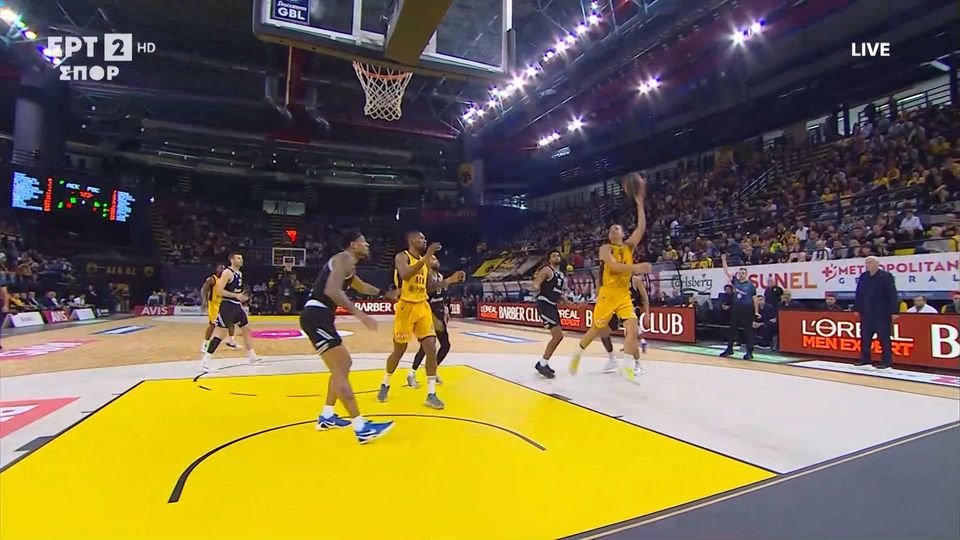 Με υπέροχο τρόπο ο Δημήτρης Φλιώνης στάθηκε στον αέρα και σκόραρε, κερδίζοντας και το φάουλ για το 8-6 της ΑΕΚ.