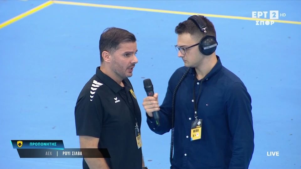 Ο Ρουί Σίλβα μίλησε στην κάμερα της ΕΡΤ μετά το τέλος του αγώνα με τον Ολυμπιακό και τη νίκη της ομάδας χάντμπολ της ΑΕΚ (28-27) και τόνισε πως είναι ικανοποιημένος από την εμφάνιση των παικτών του. «Όσον αφορά στο αγωνιστικό κομμάτι. Είμαι πολύ ευχαριστημένος από τους παίκτες μου, θα ήθελα να τους συγχαρώ. Είμαστε ακόμα στην αρχή της σεζόν, αλλά ήταν μια σημαντική νίκη για την ΑΕΚ σε ένα μεγάλο ντέρμπι.