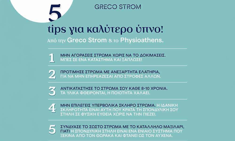 Η Greco Strom σε συνεργασία με το Physioathens, του φυσικοθεραπευτή Νάσου Κουτσουραδή, μοιράζεται μαζί σας 5 σημαντικά tips για καλύτερο ύπνο.