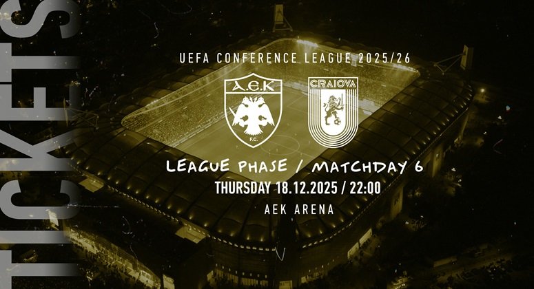 Η ΠΑΕ ΑΕΚ ενημερώνει ότι τέθηκαν σε κυκλοφορία τα εισιτήρια του εντός έδρας αγώνα για τη League Phase του UEFA Conference League με αντίπαλο την CS UNIVERSITATEA CRAIOVA, ο οποίος θα διεξαχθεί στην OPAP Arena την Πέμπτη 18 Δεκεμβρίου στις 22:00.