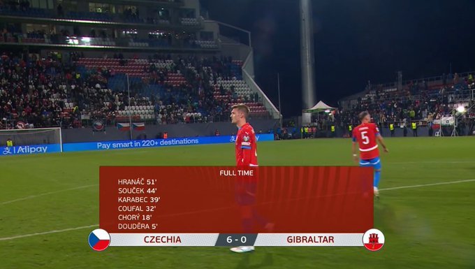 Σε ένα αδιάφορο βαθμολογικά παιχνίδι, η Τσεχία φιλοδώρησε με έξι τέρματα το Γιβραλτάρ(6-0) και έκλεισε ιδανικά τις υποχρεώσεις της στα προκριματικά του Μουντιάλ. Θυμίζουμε πως οι Τσέχοι έχουν πάρει το απευθείας εισιτήριο για τα γήπεδα των ΗΠΑ. Δίχως βαθμό τελείωσαν το ματς οι φιλοξενούμενοι.