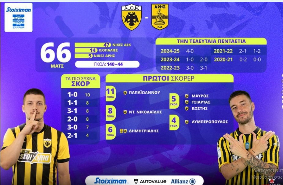 Συνολικά, στις αναμετρήσεις τους και στις δύο έδρες για το πρωτάθλημα, η ΑΕΚ μετρά οκτώ νίκες και δύο ισοπαλίες σε ένα αήττητο σερί δέκα αγώνων που ξεκίνησε μετά την επικράτηση του Άρη στις 14 Μαΐου 2022 με 3-2 στη Θεσσαλονίκη.