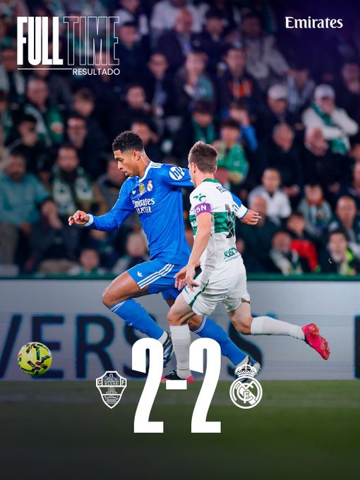 Νέα γκέλα για τη Ρεάλ, που σε λίγες μέρες έρχεται στην Ελλάδα για να αντιμετωπίσει τον Ολυμπιακό. Η «Βασίλισσα» αναδείχθηκε ισόπαλη 2-2 με την Έλτσε, σώζοντας μάλιστα τον βαθμό στο 88’ και πλέον η Μπαρτσελόνα βρίσκεται σε απόσταση...αναπνοής. Σημαντικός πόντος για τους γηπεδούχους, οι οποίοι φωνάζουν και για το γκολ του Μπέλιγχαμ για επιθετικό φάουλ του Τσουαμενί πάνω στον Πένια.
