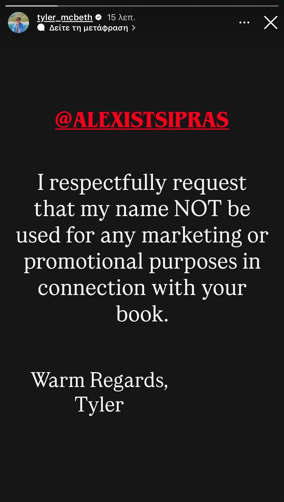 Με ένα story στο instagram, ο Τάιλερ Μακμπέθ απευθύνεται στον Αλέξη Τσίπρα γράφοντάς του: «Ζητώ με σεβασμό το όνομά μου να ΜΗΝ χρησιμοποιείται για οποιονδήποτε σκοπό σκοπό διαφήμισης ή προώθησης σε σχέση με το βιβλίο σας».