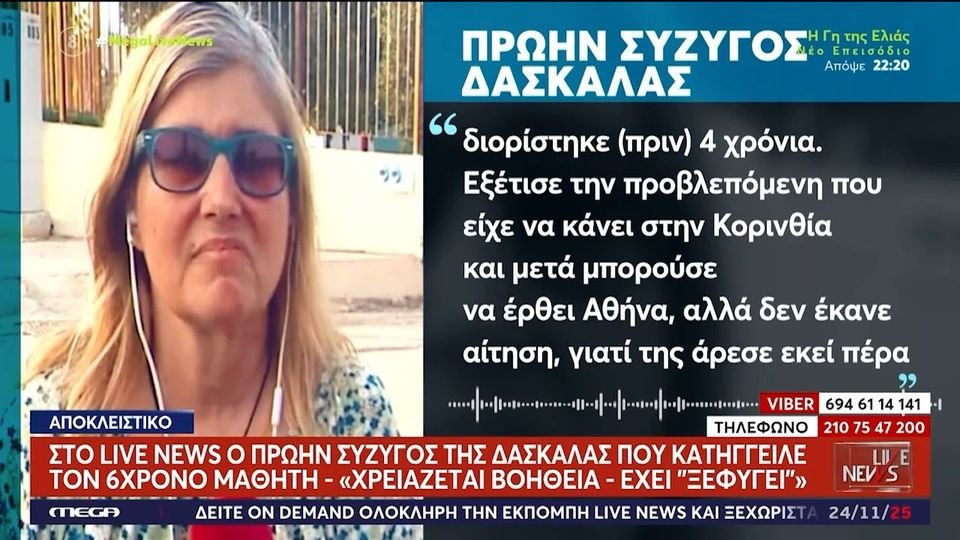 Ο πρώην σύζυγος της εκπαιδευτικού, υποστήριξε πως η γυναίκα «είχε προβλήματα» και «προσπαθούσαμε να τη βοηθήσουμε ψυχολογικά, ηθικά και τα λοιπά, όλα αυτά τα χρόνια. Δεν δέχτηκε τις αξιολογήσεις. Δούλευε τόσα χρόνια στα σχολεία, διορίστηκε (πριν) τέσσερα χρόνια. Εξέτισε την προβλεπόμενη που είχε να κάνει στην Κορινθία και μετά μπορούσε να έρθει Αθήνα, αλλά δεν έκανε αίτηση γιατί της άρεσε εκεί πέρα και εμένα με άφησε μόνο μου με τα παιδιά, με τους γονείς της».