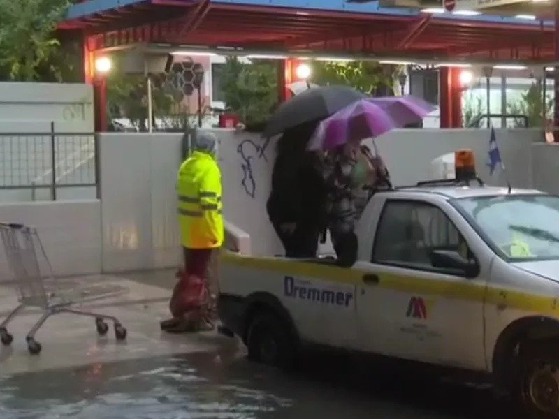 Εξαιτίας της έντονης βροχόπτωσης, άνδρες του Δήμου Μοσχάτου μετέφεραν κόσμο σε καρότσες από και προς τον σταθμό του ηλεκτρικού, αφού δρόμοι και πεζοδρόμια είναι γεμάτα με νερά.