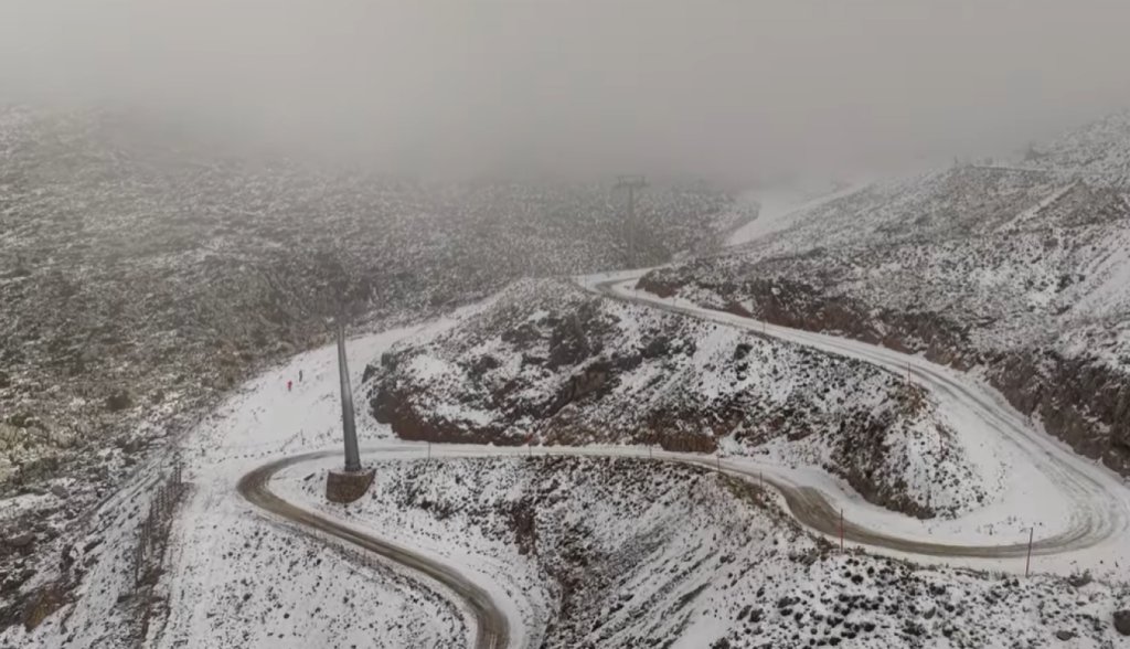 Το νέο τοπίο αποτυπώνεται εντυπωσιακά σε βίντεο drone του Up Stories, που δείχνει από ψηλά τις χιονισμένες πλαγιές και τις κορυφές του βουνού.