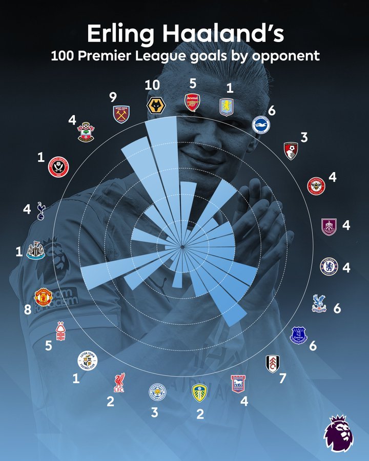 Όμως δεν σταματάει εκεί...Ο Έρλινγκ Χάαλαντ έχει φτάσει σε αυτό το ορόσημο έχοντας σκοράρει εναντίον κάθε αντιπάλου ομάδας στην Premier League, την οποία έχει αντιμετωπίσει, όπως αναφέρει χαρακτηριστικά σε ανάρτησή της στα social media η Premier League . Τα 100 γκολ του έχουν κατανεμηθεί σε 23 ομάδες, αν και υπάρχουν τρεις ομάδες εναντίον των οποίων ο Χάαλαντ ήταν ιδιαίτερα παραγωγικός, σκοράροντας συνολικά 27 γκολ: 10 εναντίον της Γουλβς, 9 εναντίον της Γουέστ Χαμ και 8 εναντίον της Μάντσεστερ Γιουνάιτεντ.