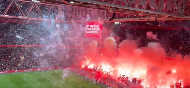 Ο αγώνας διακόπηκε στο 5ο λεπτό, αφού οι οπαδοί του Άγιαξ πυροδότησαν δύο φορές πυροτεχνήματα. Οι διαιτητές δέχτηκαν επίθεση και μια έξοδος κινδύνου άνοιξε διά της βίας, επιτρέποντας στους οπαδούς να εισέλθουν στο στάδιο ανεξέλεγκτα.