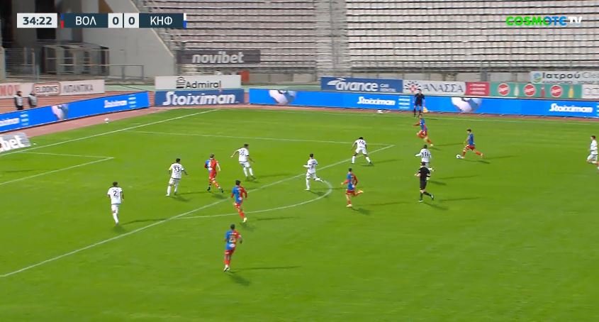 Στο 35’ ο Μύγας έκανε το γύρισμα από δεξιά και ο Πίντσι σούταρε πάνω στον Ραμίρες