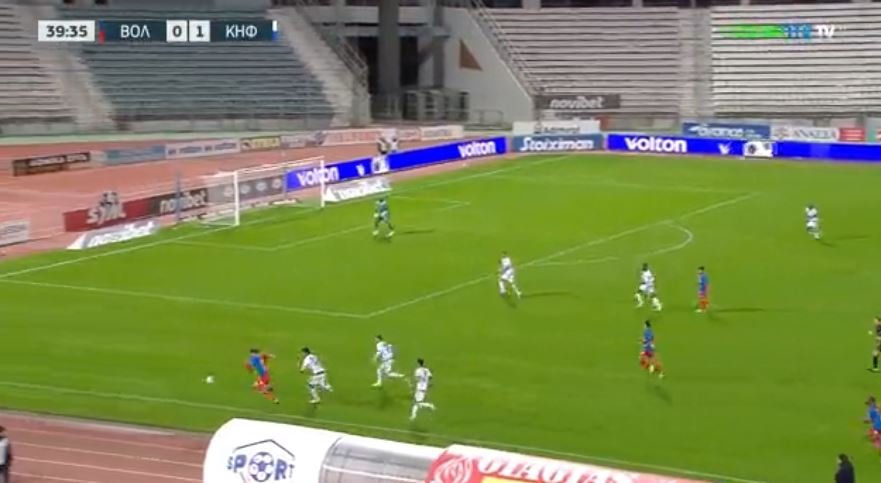 Στο 36’ ο Σιμόν έκανε το σουτ, η μπάλα άλλαξε πορεία στα πόδια του Κάργα και κατέληξε στα δίχτυα του Βόλου για το 0-1.