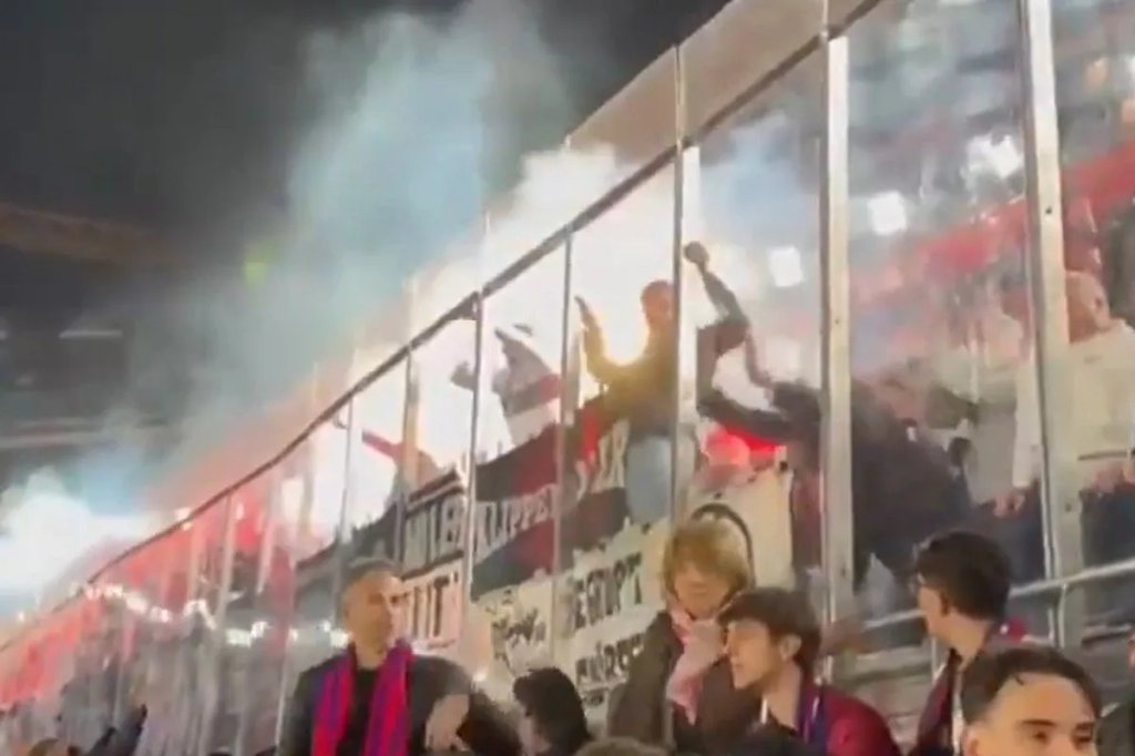 Οι οπαδοί της γερμανικής ομάδας πέταξαν φωτοβολίδες και ποτήρια, ενώ κόντεψαν να γκρεμίσουν το προστατευτικό που τους χώριζε από τους οπαδούς της Μπαρτσελόνα.