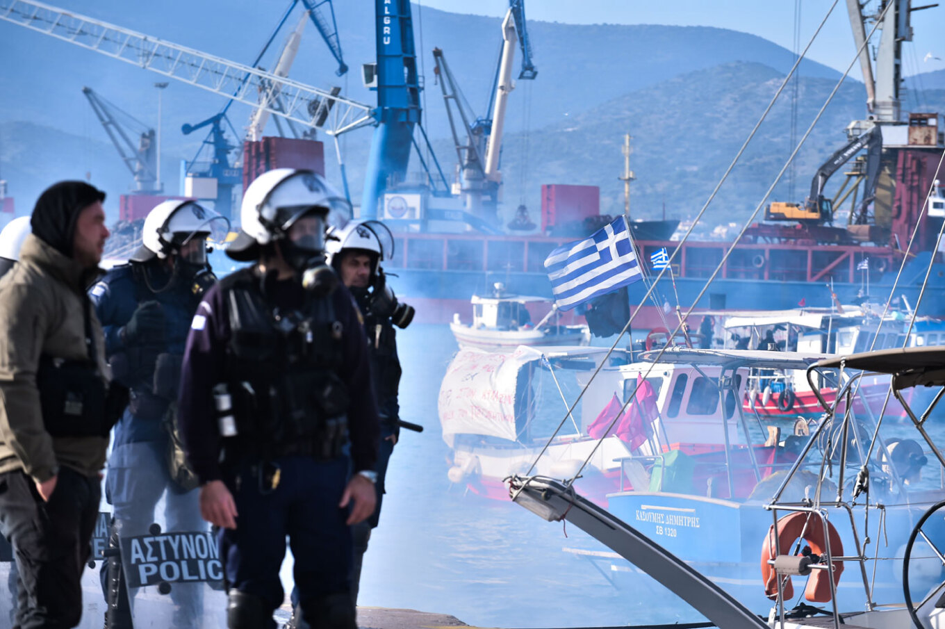 Το λιμάνι του Βόλου ήταν αποκλεισμένο από αγρότες και κτηνοτρόφους από τη στεριά, ενώ ψαράδες το είχαν μπλοκάρει μέσω θαλάσσης ως ένδειξη συμπαράστασης.