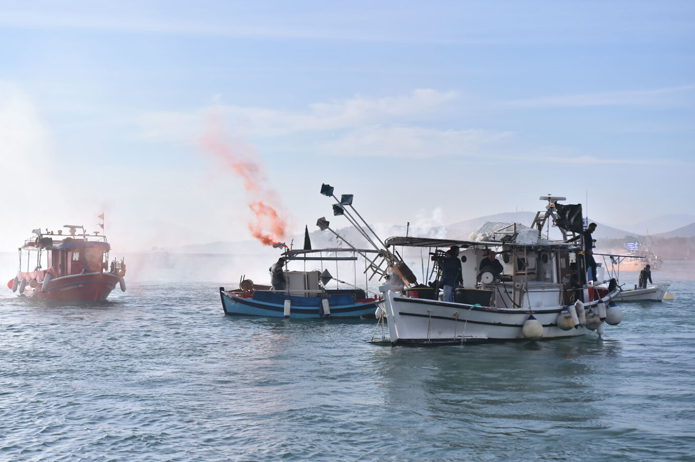 Παράλληλα αποκλεισμό στο λιμάνι επιχειρούν και οι αλιείς του Βόλου από τη θάλασσα.