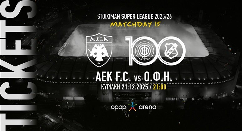 Η ΠΑΕ ΑΕΚ ανακοινώνει ότι άρχισε η διάθεση των εισιτηρίων για το ματς της 15ης αγωνιστικής του Πρωταθλήματος με αντίπαλο τον ΟΦΗ, που θα διεξαχθεί την Κυριακή 21 Δεκεμβρίου στις 21:00, στην OPAP Arena.