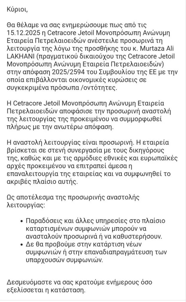 Η εταιρεία εμπορίας πετρελαιοειδών Cetracore-Jetoil SA ανέστειλε την Τρίτη αιφνιδιαστικά τη λειτουργία της λόγω των κυρώσεων στη Ρωσία.