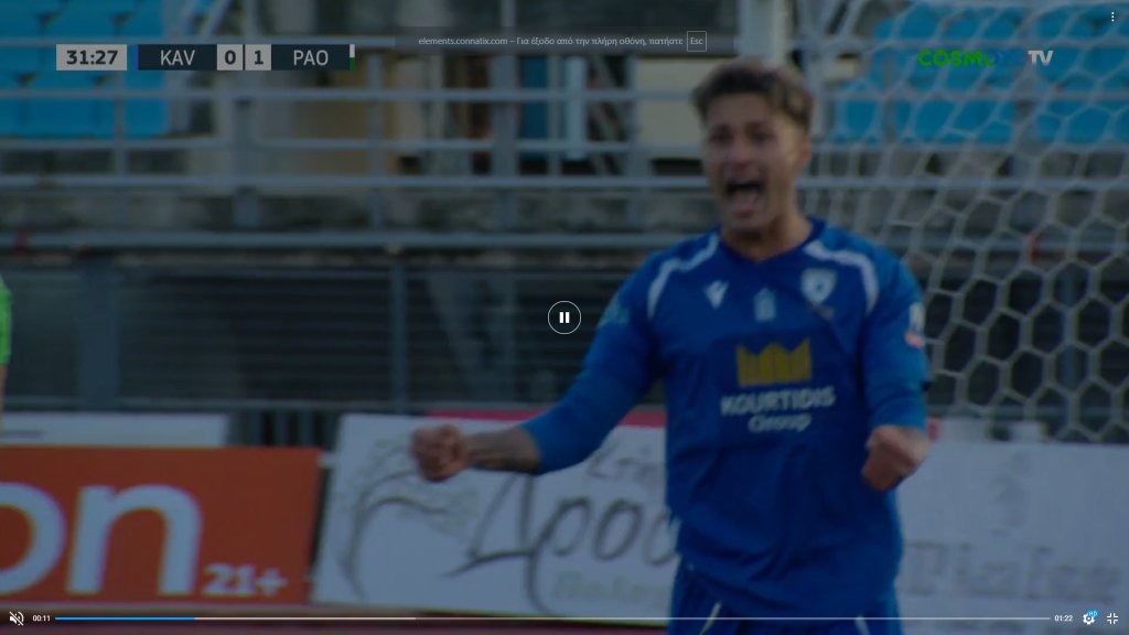 Ισοφαρίζει η Καβάλα στο 34', με την εύστοχη εκτέλεση του Σιφναίου, που στέλνει την μπάλα ψηλά στην δεξιά πλευρά του Κότσαρη