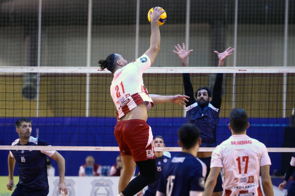 Ο Φλοίσβος ανέβασε την πίεση στο σερβίς, έβαλε δύσκολα στον Ολυμπιακό, τον ακολούθησε στο σκορ και με σερί 3-0 από το σερβίς του Βαν Γκάρντερεν προσπέρασε πρώτη φορά 17-16. Ο Ολυμπιακός παρότι στο 2ο σετ άγγιξε 58% αποτελεσματικότητα στην υποδοχή έκανε πολλά εύκολα λάθη δίνοντας στον Φλοίσβο την ευκαιρία όχι μόνο να ακολουθεί το ράλι αλλά και προηγηθεί με +2 (23-21) με τον Βαν Γκάρντερεν. Ο Λινάρδος με επίθεση και το λάθος του Βαν Γκάρντερεν έφεραν το ματς στα ίσια 23-23. Ο Εγκλεσκαλνς έκανε το 24-23 σε βάρος την παλιάς του ομάδας αλλά ο Βαν Γκάρντερεν έχασε πάλι το σερβίς για το 24-24. Ο Φλοίσβος με δύο καθοριστικές επιθέσεις του Κόβαρ έκανε το 26-24 και το 1-1 σετ.