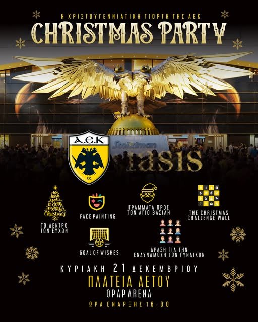 Η χριστουγεννιάτικη γιορτή της ΠΑΕ ΑΕΚ στη Νέα Φιλαδέλφεια την ερχόμενη Κυριακή, που θα είναι ανοικτή για όλους, θα είναι γεμάτη happenings και εκπλήξεις για τους μικρούς μας φίλους, με παιχνίδια, διαγωνισμούς, face painting, με γράμματα στον Αη Βασίλη και με το Δέντρο των Ευχών.