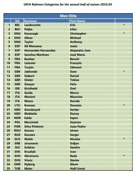 Ενόψει του δεύτερου μισού της σεζόν 2025-2026, η UEFA ανακοίνωσε τους νέους πίνακες διαιτησίας.