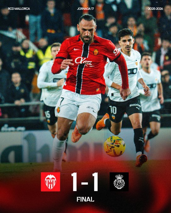 Σε ένα ματς γεμάτο πάθος, ένταση και ελάχιστες καλές στιγμές, Βαλένθια και Μαγιόρκα αναδείχθηκαν ισόπαλες 1-1, αποτέλεσμα που βολεύει περισσότερο τους φιλοξενούμενους, οι οποίοι ανέβηκαν στους 18 βαθμούς και βρέθηκαν στο +3 από τη ζώνη του υποβιβασμού. Στους 16 βαθμούς η ομάδα του Κορμπεράν, που κινδυνεύει να βρεθεί εντός επικίνδυνης ζώνης μετά το πέρας της 17ης αγωνιστικής.