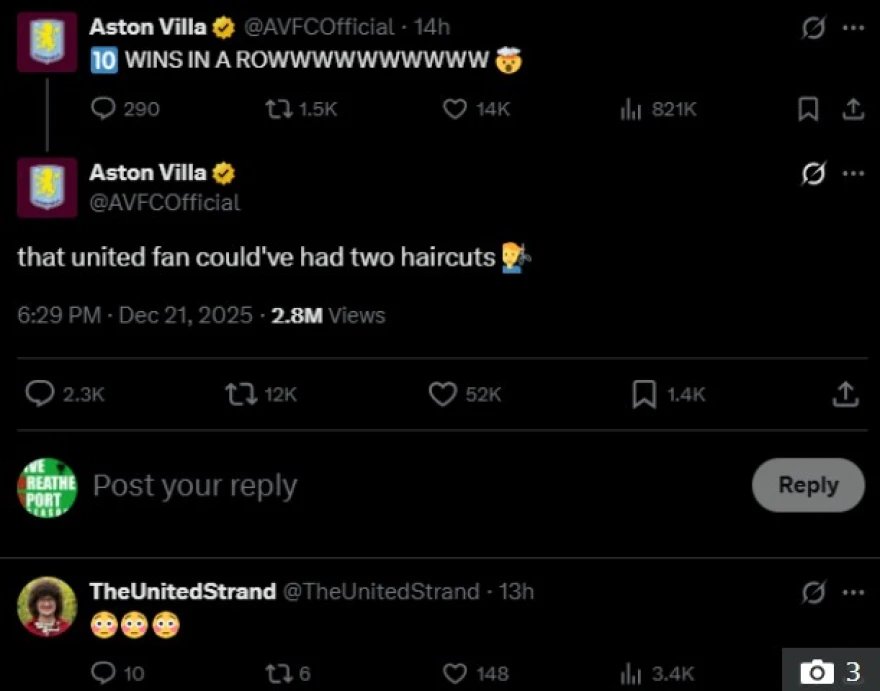 Κάτω από την ανάρτηση του συλλόγου που πανηγύριζε τις 10 συνεχόμενες νίκες, έγραψε χαρακτηριστικά: «Αυτός ο οπαδός της Γιουνάιτεντ θα μπορούσε να είχε κάνει δύο κουρέματα».