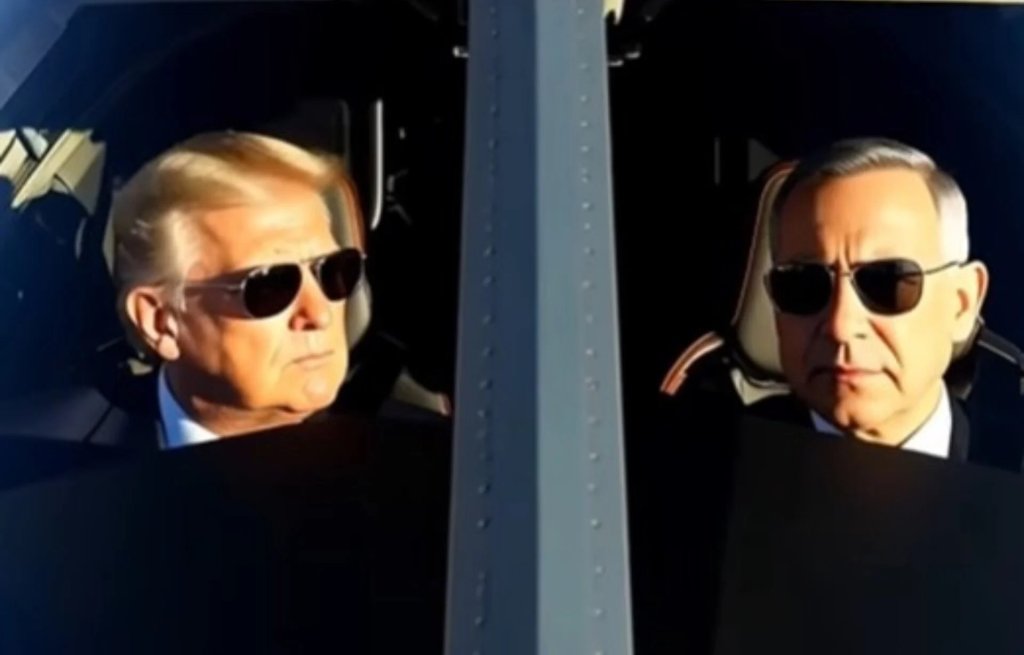 Ο Νετανιάχου εμφανίζεται στο πιλοτήριο ενός βομβαρδιστικού B-2, ίδιου τύπου με εκείνα που χρησιμοποιήθηκαν στην επίθεση κατά των ιρανικών πυρηνικών υποδομών, έχοντας στο πλευρό του τον πρόεδρο των ΗΠΑ.