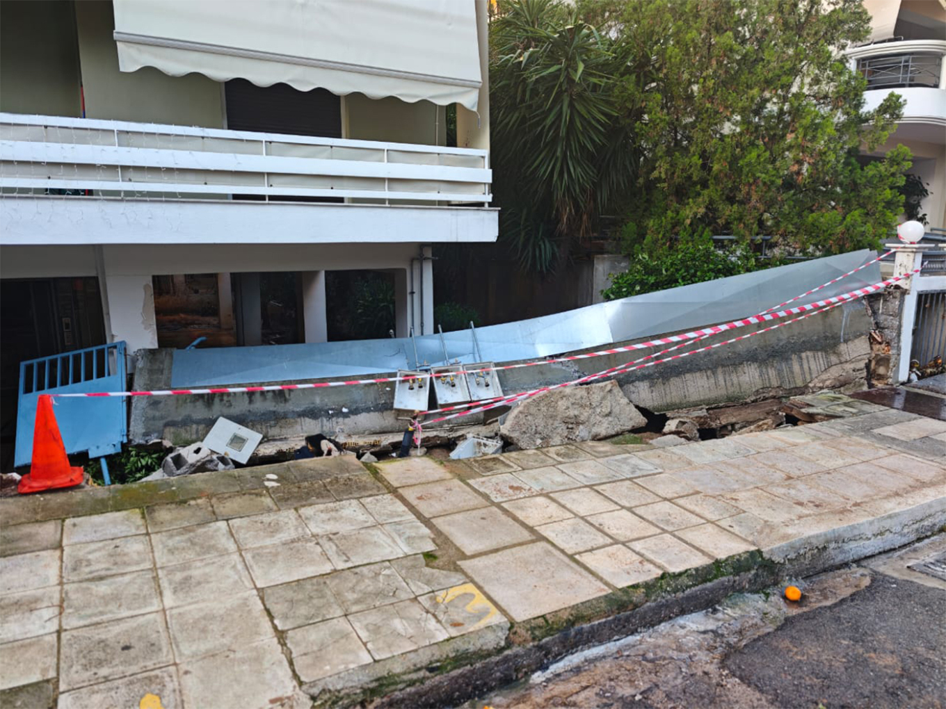 Στην οδό Λυσικράτους, τα ορμητικά νερά κάλυψαν το οδόστρωμα με αποτέλεσμα μια μάντρα πολυκατοικίας να καταρρεύσει και να «βουλιάξει» στην είσοδο της οικοδομής.