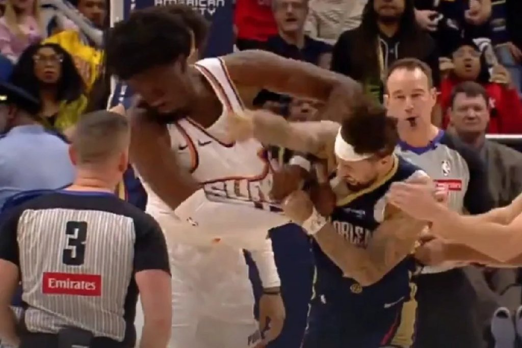 Ο Αλβαράδο (1μ.83) των Πέλικανς χρεώθηκε με φάουλ για σπρώξιμο, τα έβαλε με τον Γουίλιαμς (2μ.16) των Σανς και ακολούθησαν 6-7 μπουνιές, προτού οι δυο παίκτες αποβληθούν.