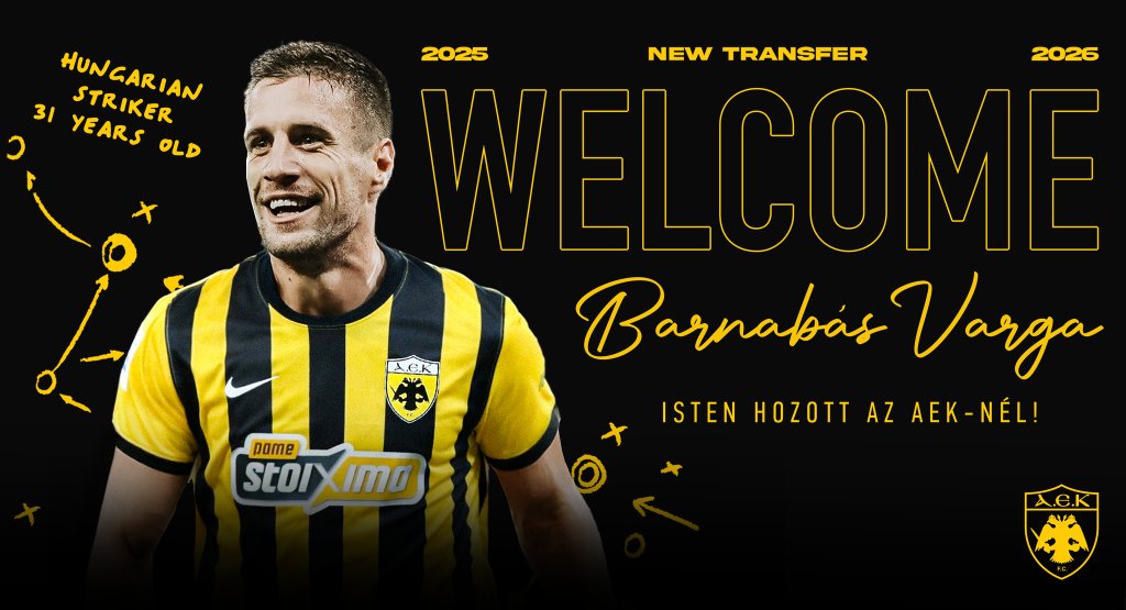 Η ΠΑΕ ΑΕΚ ανακοινώνει την απόκτηση του ποδοσφαιριστή Μπάρναμπας Βάργκα, με μεταγραφή από τη Φερεντσβάρος. Ο Ούγγρος διεθνής επιθετικός υπέγραψε συμβόλαιο συνεργασίας με την ομάδα μας έως το καλοκαίρι του 2029.