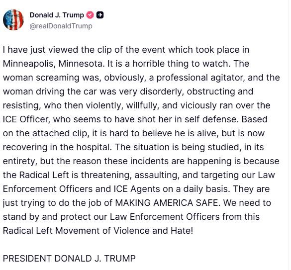 «Μόλις είδα το βίντεο από το συμβάν που έλαβε χώρα στη Μινεάπολη της Μινεσότα. Είναι φρικτό να το βλέπεις. Η γυναίκα που ούρλιαζε ήταν, προφανώς, επαγγελματίας ταραχοποιός, και η γυναίκα που οδηγούσε το αυτοκίνητο ήταν πολύ απείθαρχη, εμπόδιζε και αντιστεκόταν, στη συνέχεια τράπηκε βίαια, εκούσια και άγρια πάνω στον αστυνομικό της ICE, ο οποίος φαίνεται να την πυροβόλησε σε αυτοάμυνα. Με βάση το βίντεο, είναι δύσκολο να πιστέψει κανείς ότι είναι ζωντανός, αλλά τώρα αναρρώνει στο νοσοκομείο. Η κατάσταση μελετάται στο σύνολό της, αλλά ο λόγος που συμβαίνουν αυτά τα περιστατικά είναι επειδή η Ριζοσπαστική Αριστερά απειλεί, επιτίθεται και στοχοποιεί τους αστυνομικούς και τους πράκτορες της ICE σε καθημερινή βάση. Απλώς προσπαθούν να κάνουν τη δουλειά τους να ΚΑΝΟΥΝ ΤΗΝ ΑΜΕΡΙΚΗ ΑΣΦΑΛΗ. Πρέπει να σταθούμε δίπλα και να προστατεύσουμε τους αστυνομικούς από αυτό το Ριζοσπαστικό Αριστερό Κίνημα Βίας και Μίσους!».