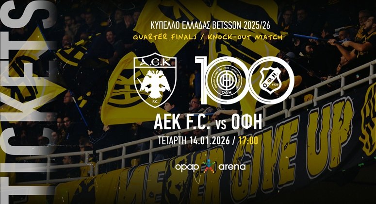 Η ΠΑΕ ΑΕΚ ανακοινώνει ότι άρχισε η διάθεση των εισιτηρίων για τον προημιτελικό του Κυπέλλου Ελλάδας απέναντι στον ΟΦΗ, που θα διεξαχθεί την Τετάρτη 14 Ιανουαρίου στις 17:00, στην OPAP Arena.