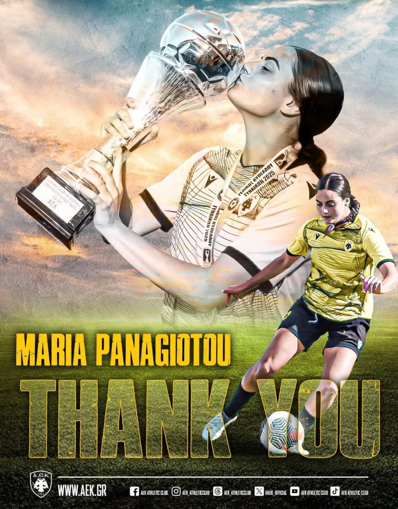 «Η ΑΕΚ ανακοινώνει την κοινή συναινέσει λύση της συνεργασίας με την ποδοσφαιρίστρια, Μαρία Παναγιώτου.