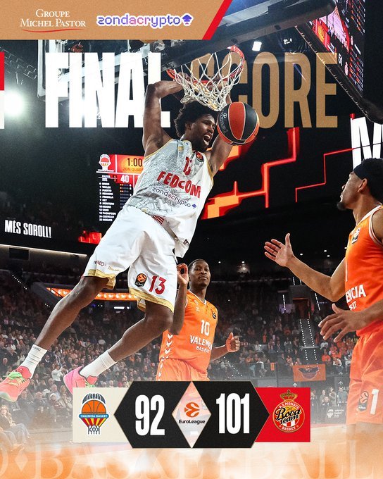 Η Μονακό (14-7) πήρε ένα σπουδαίο «διπλό» (101-92) στην «Roig Arena» απέναντι στην Βαλένθια (14-7), πανηγύρισε την πέμπτη συνεχόμενη νίκη της στην Euroleague και ανέβηκε -έστω και προσωρινά- στην κορυφή της βαθμολογίας. Η Βαλένθια μπήκε πιο δυνατά στο παρκέ, προηγήθηκε με 21-14, όμως από την στιγμή που η Μονακό πέρασε μπροστά δεν κοίταξε ποτέ ξανά πίσω. Για τους Ισπανούς αυτή ήταν μόλις η δεύτερη εντός έδρας ήττα στην διοργάνωση.
