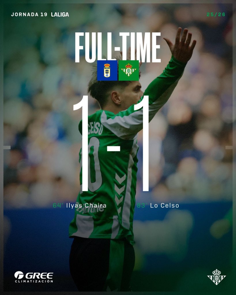 Στο "Carlos Tartiere", η Μπέτις είχε δυο δοκάρια, προτού βρεθεί πίσω στο σκορ, αλλά, έμεινε όρθια, 1-1, χάρη στο γκολ του Λο Σέλσο, που σκόραρε για πρώτη φορά μετά τον Αύγουστο. Η Οβιέδο είχε καλή παρουσία, όμως, συμπλήρωσε 12 σερί ματς Πρωταθλήματος χωρίς νίκη.
