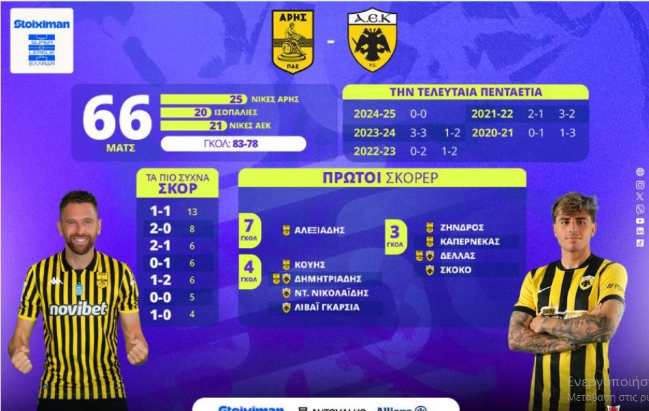 Ισόπαλα έχουν ολοκληρωθεί τα δύο τελευταία παιχνίδια των δύο ομάδων για την κανονική διάρκεια του πρωταθλήματος με γηπεδούχο τον Άρη, αφού το 2024-25, για την 26η αγωνιστική, αναδείχθηκαν ισόπαλοι 0-0, ενώ το 2023-24, πάλι για την 26η και τελευταία αγωνιστική του πρωταθλήματος, ολοκλήρωσαν τις προσπάθειές τους με το εντυπωσιακό 3-3.
