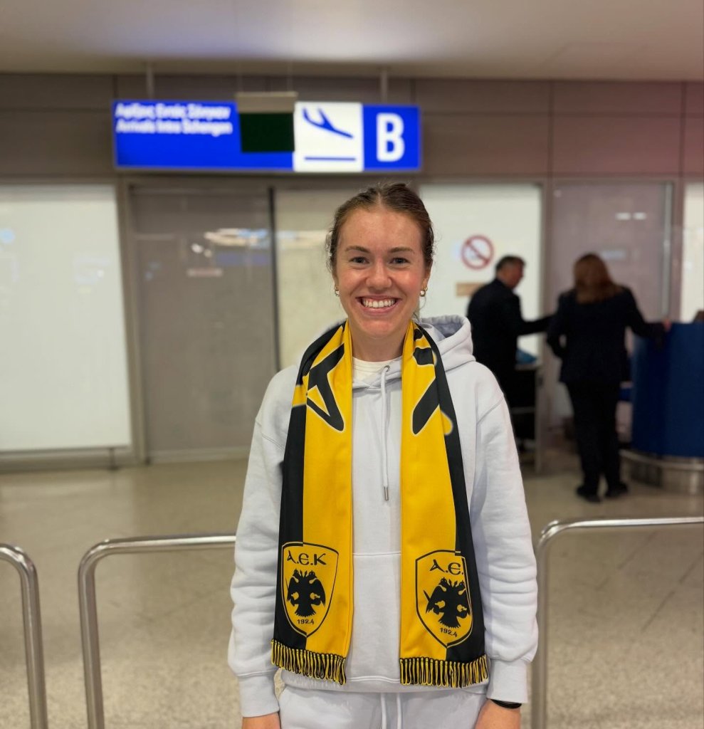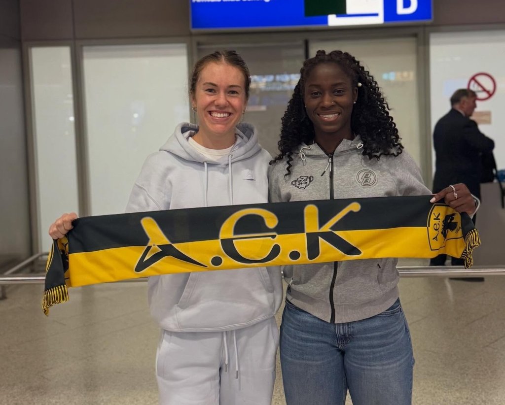 Στην Αθήνα έφθασαν χθες βράδυ τα δύο νέα μεταγραφικά αποκτήματα της ΑΕΚ, Μανγίμα Στίβελμανς και Ελίζαμπεθ Χιλ. Στο «Ελ. Βενιζέλος» τις δυο παίκτριες της ομάδας ποδοσφαίρου γυναικών της Ένωσης τις υποδέχθηκαν ο Τεχνικός Διευθυντής του τμήματος Ποδοσφαίρου Γυναικών, Χρήστος Χριστόπουλος και ο Team Manager, Ηλίας Μουρούσιας