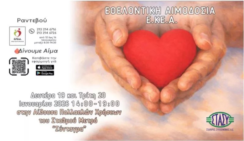 Με το ξεκίνημα της νέας χρονιάς, το Εθνικό Κέντρο Αιμοδοσίας (ΕΚΕΑ) και η ΣΤΑΣΥ ΑΕ ενώνουν τις δυνάμεις τους και προσκαλούν τους πολίτες για μία στάση ζωής στην καρδιά της πόλης: Διήμερη αιμοδοσία στις 19 και 20 Ιανουαρίου, από τις 14:00 έως τις 19:00, στην αίθουσα του Μετρό Συντάγματος.