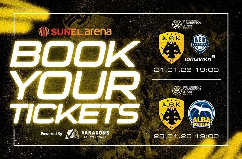 Στις 21 Ιανουαρίου και στις 28 του ίδιου μήνα, η ΑΕΚ υποδέχεται Καρδίτσα και Άλμπα Βερολίνου αντίστοιχα, για τη φάση των "16" του Basketball Champions League. Η ΚΑΕ έβγαλε ανακοίνωση, ενημερώνοντας ότι ξεκίνησε η ηλεκτρονική διάθεση των εισιτηρίων, για τις δυο αναμετρήσεις στη SUNEL Arena.