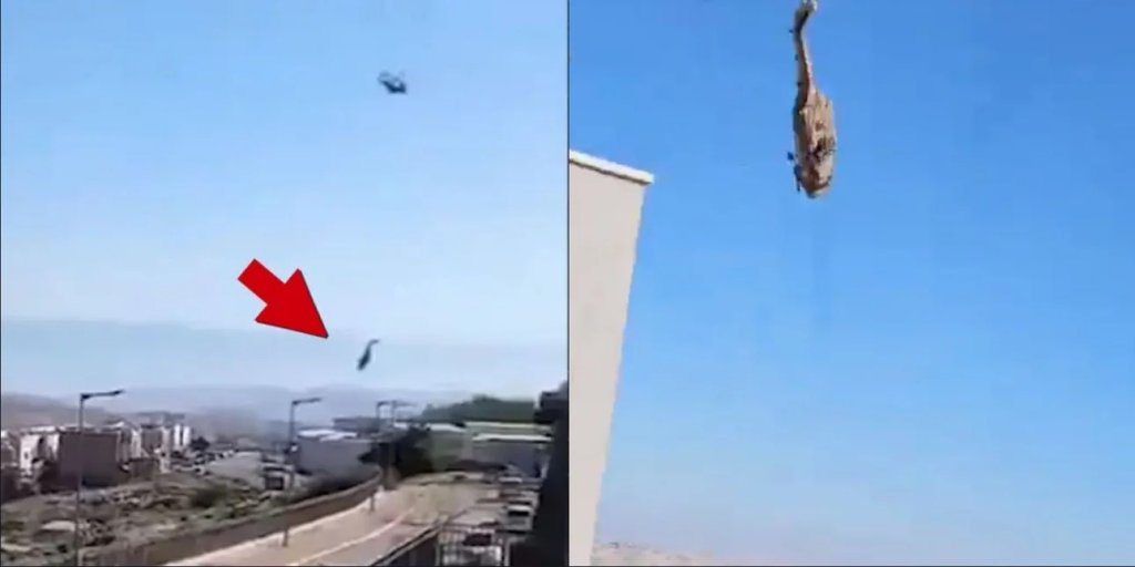 Δραματικές εικόνες καταγράφουν τη στιγμή που ελικόπτερο της Πολεμικής Αεροπορίας του Ισραήλ αποσπάται από τα ιμάντα ανάρτησης και πέφτει στο έδαφος, κατά τη διάρκεια επιχείρησης αερομεταφοράς από δεύτερο ελικόπτερο.