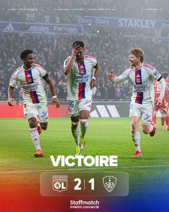Τη νίκη με 2-1 πανηγύρισε η Λιόν επί της Μπρεστ και πάτησε τετράδα. Στο 19’ η Μπρεστ έμεινε με δέκα παίκτες, λόγω αποβολής του Ντελ Καστίγιο, με την Λιόν να εκμεταλλεύεται τον παίκτη παραπάνω στο 41’ και να ανοίγει το σκορ με τον Σουλτς. Στο 45+4’ οι «λιονέ» πέτυχαν και δεύτερο τέρμα με τον Βινίσιους και στο 87’ ο Ντίνα Εμπιμπέ έγραψε το τελικό 2-1.