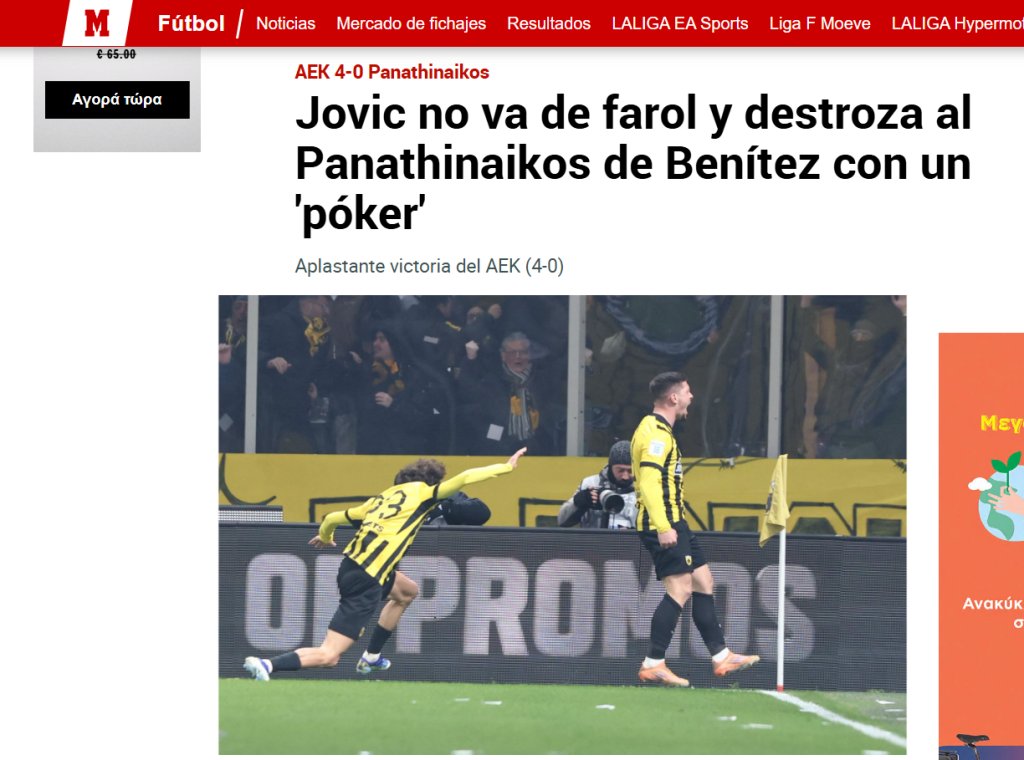 Αποθέωση και στη Marca για τον Λούκα Γιόβιτς. Το κορυφαίο ισπανικό αθλητικό Μέσο κάνει ιδιαίτερη αναφορά στην επική εμφάνιση του Σέρβου φορ. «Ο Γιόβιτς δεν μπλοκάρει και διαλύει τον Παναθηναϊκό του Μπενίτεθ με… πόκερ» είναι ο τίτλος του άρθρου με το ρεπορτάζ να προσθέτει: «Τα μονοπάτια του Λούκα Γιόβιτς και του Ράφα Μπενίτεθ συναντήθηκαν στη Ρεάλ. Ο Σέρβος όμως δεν έδειξε έλεος κατεδαφίζοντας τον Παναθηναϊκό με τέσσερα γκολ».