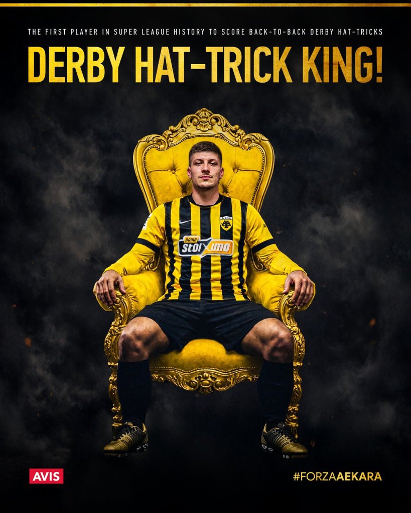 Η αποθέωση για τον Λούκα Γιόβιτς συνεχίζεται… Η ΠΑΕ ΑΕΚ έφτιαξε μία φωτογραφία για τον «Βασιλιά των ντέρμπι Λούκα»! Τον πρώτο παίκτη στη Σούπερ Λίγκα ιστορικά που έκανε σε δύο σερί ντέρμπι χατ τρικ και… βάλε.