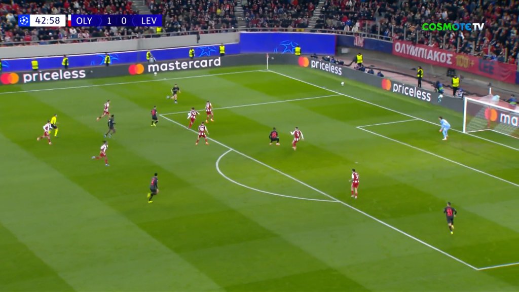 Νέα μεγάλη ευκαιρία για τη Λεβερκούζεν, ο Ποκου βρήκε τον Κοφάν αλλά ο Τζολάκης τον νίκησε στο τετ-α-τετ τους, ενώ στη συνέχεια μπλόκαρε και μακρινό σουτ του Γκριμάλδο!