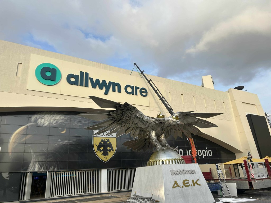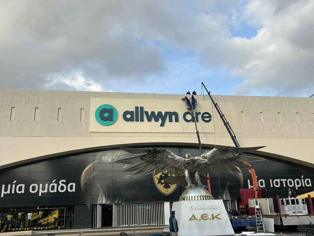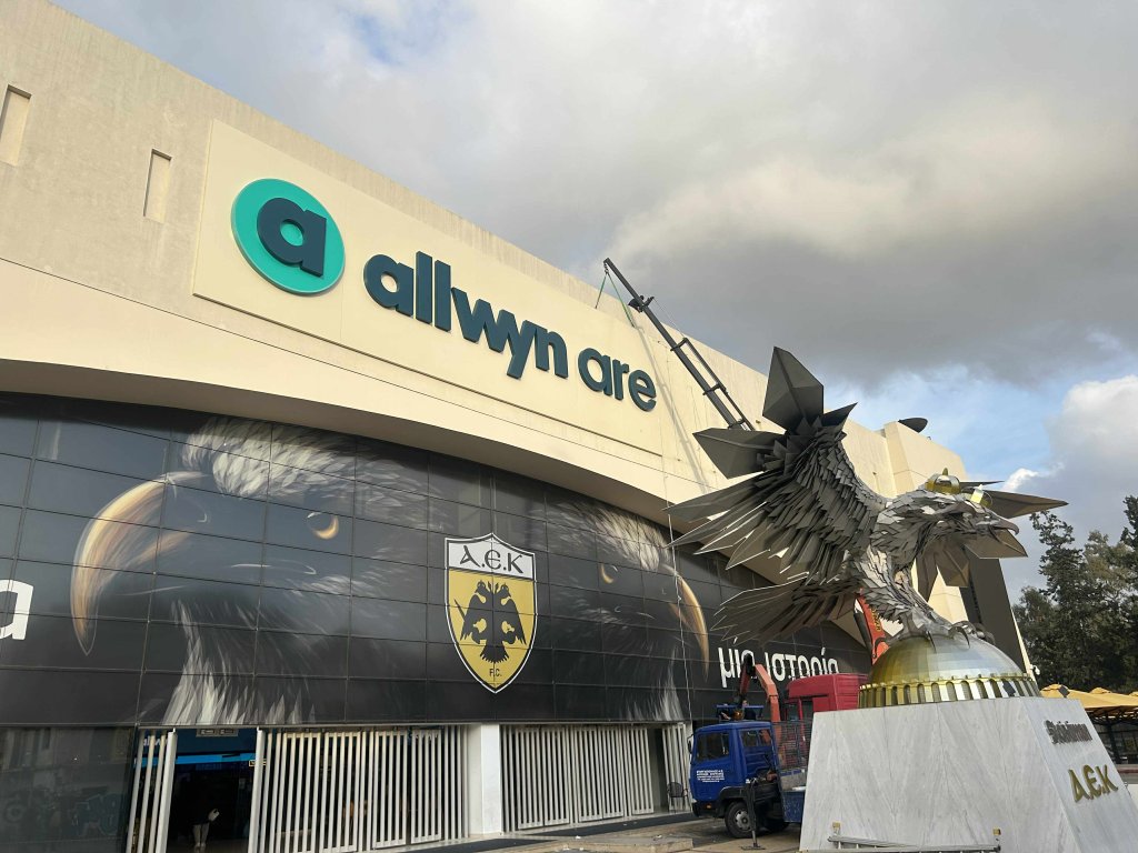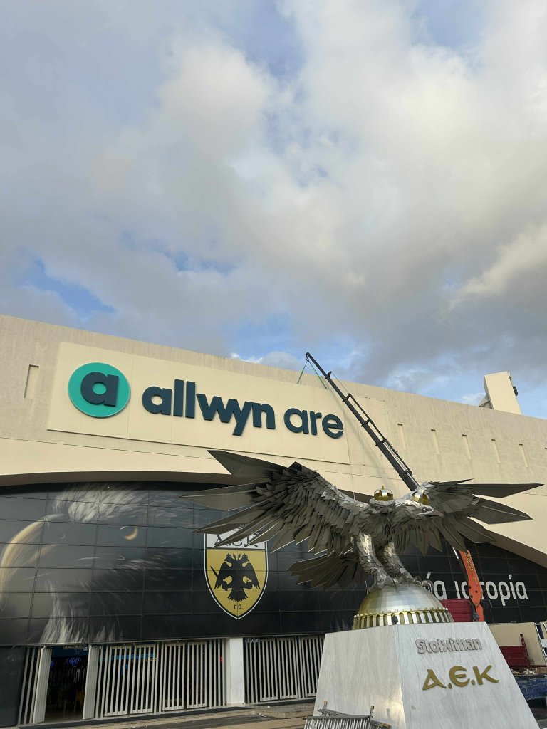 Την τελική της μορφή παίρνει η νέα επιγραφή στην πρόσοψη του Ναού. Η εμπορική ονομασία της «Αγιά Σοφιά» αλλάζει από ΟΠΑΠ σε Allwyn Arena. Όπως φαίνεται και στις εικόνες, οι εργασίες προχωρούν με γοργούς ρυθμούς και η νέα επιγραφή είναι πλέον σχεδόν έτοιμη.