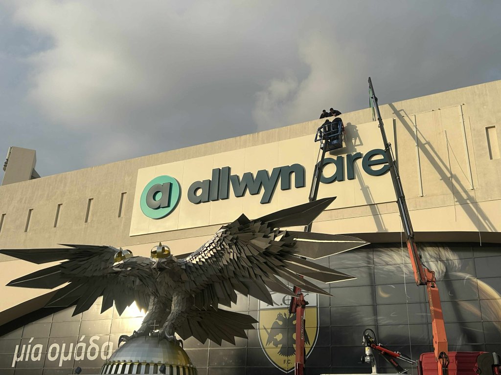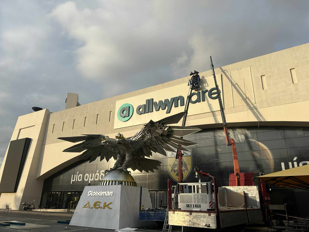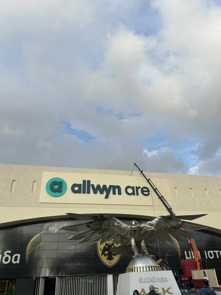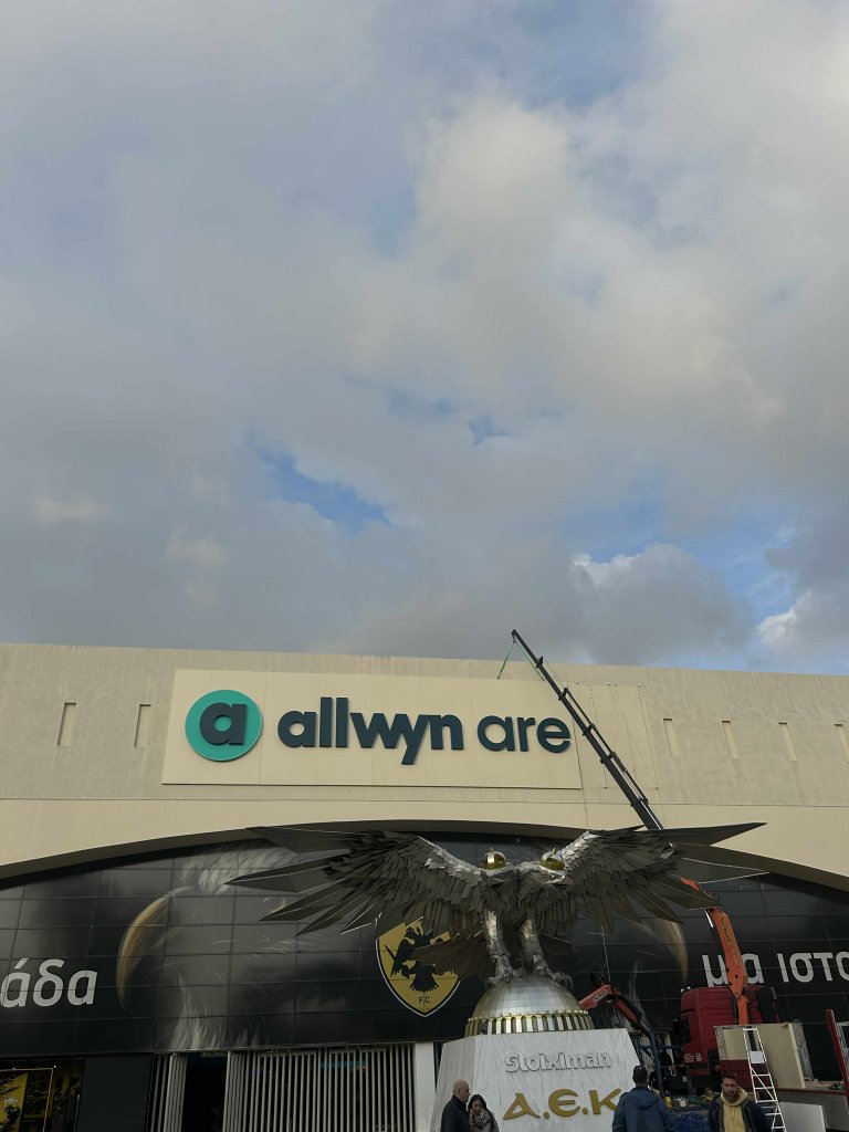 Την τελική της μορφή παίρνει η νέα επιγραφή στην πρόσοψη του Ναού. Η εμπορική ονομασία της «Αγιά Σοφιά» αλλάζει από ΟΠΑΠ σε Allwyn Arena. Όπως φαίνεται και στις εικόνες, οι εργασίες προχωρούν με γοργούς ρυθμούς και η νέα επιγραφή είναι πλέον σχεδόν έτοιμη.