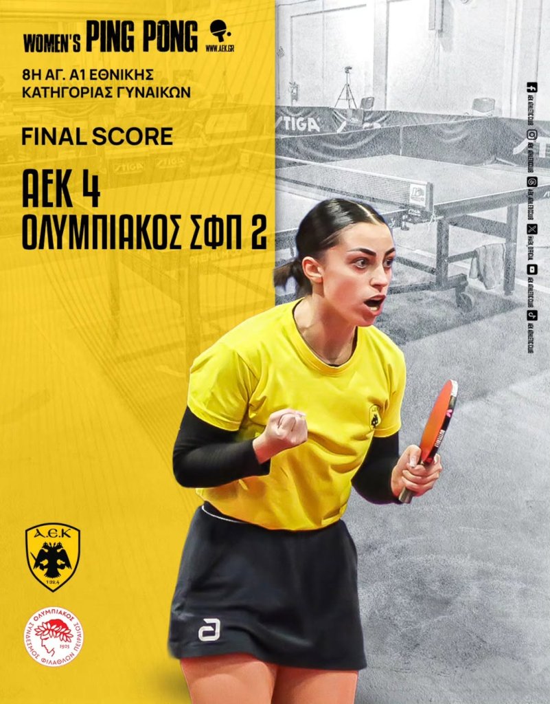 Η ΑΕΚ νίκησε με 4-2 τον Ολυμπιακό ΣΦΠ για την 8η αγωνιστική της Α1 Εθνικής Κατηγορίας Επιτραπέζιας Αντισφαίρισης Γυναικών!
