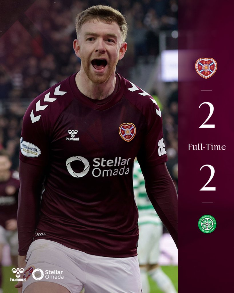 Σε ένα συναρπαστικό ντέρμπι κορυφής, Χαρτς και Σέλτικ έφεραν 2-2, με την απίθανη Χαρτς να παίζει χωρίς τον αρχηγό της, τον Σάνκλαντ των 11 γκολ, να βρίσκεται πίσω στο σκορ δυο φορές, αλλά, να παίρνει τον βαθμό. Βαθμός που την κρατάει στην κορυφή, έξι βαθμούς μπροστά από τους Πρωταθλητές Χαρτς. Στοίχισε στη Σέλτικ, το γεγονός πως έμεινε με δέκα παίκτες στο 75'.
