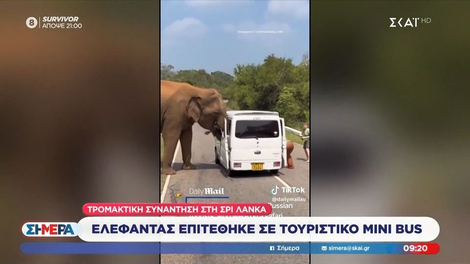 Τρομακτική συνάντηση είχαν επιβάτες mini bus στη Σρι Λάνκα με ελέφαντα.
